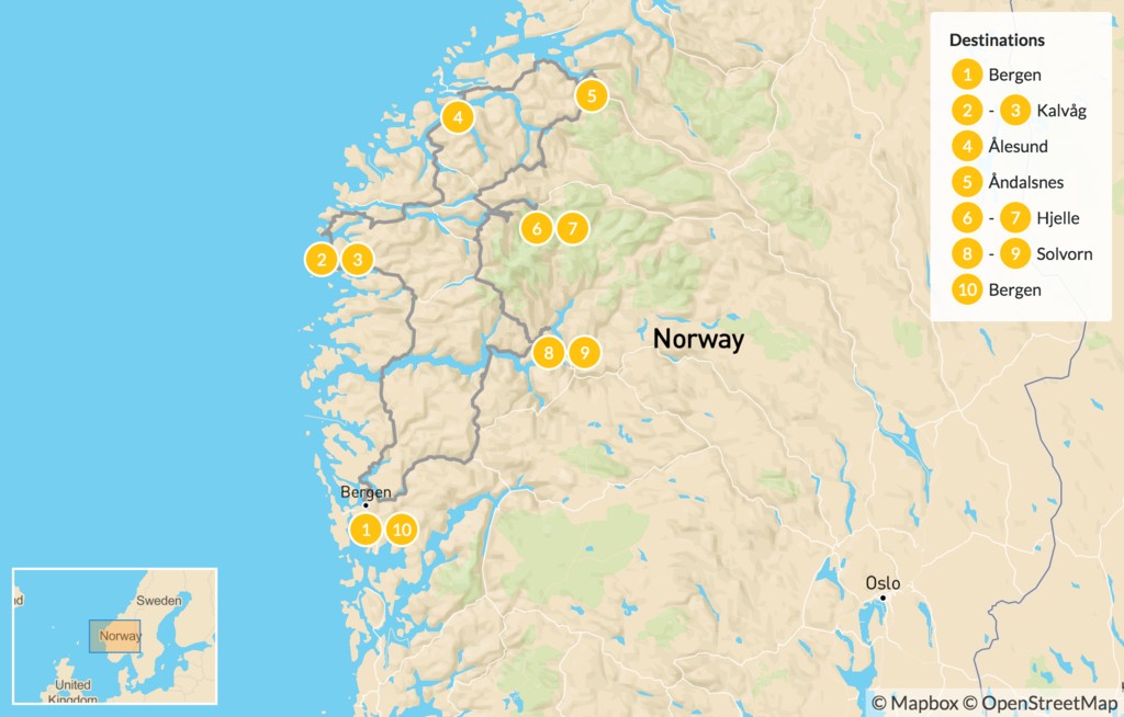 This family-friendly road trip covers a mix of popular and lesser-known destinations on Norway’s stunning west coast. Start with a few days in Bergen to explore numerous cultural opportunities and easy hiking trails. Then, pick up your rental car and head north through distinct fishing communities to get to Ålesund. From here, choose your own activities as you slowly make your way to Solvorn where you’ll stay at the oldest family-run hotel in the country before looping back to Bergen.