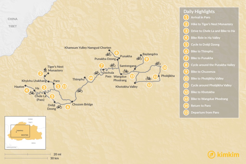 Map of Bhutan Cycling Adventure – 15 Days