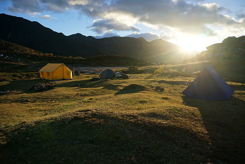Drive back to the Thimphu Valley and onward to the village of Gyenekha, where the trek starts. Begin with a short descent to the river. After crossing the river, climb until you reach a huge rock platform offering picturesque views. After another couple of hours, you’ll reach Gur, an area full of yak pastures that’s just below the main trail. You’ll camp here in a tent tonight at an altitude of 10,793 feet (3290 meters).