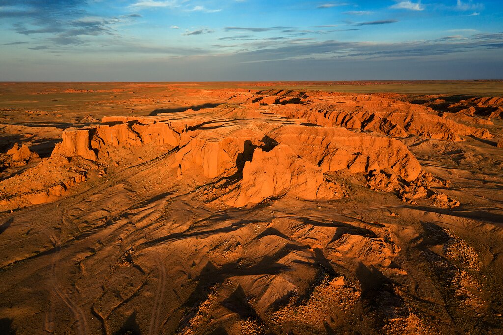 After breakfast, visit the beautiful “flaming cliffs” of the Gobi Desert. The 1920s explorer Roy Chapman Andrews spent many years exploring Mongolia in the hope of finding the remains of early humans. He did not succeed in this quest, but he did stumble across some of the most extensive fossilized remains ever discovered at Bayanzag. The cliffs are bright red, and they’re referred to as the “flaming cliffs” for their appearance at sunrise and sunset.
