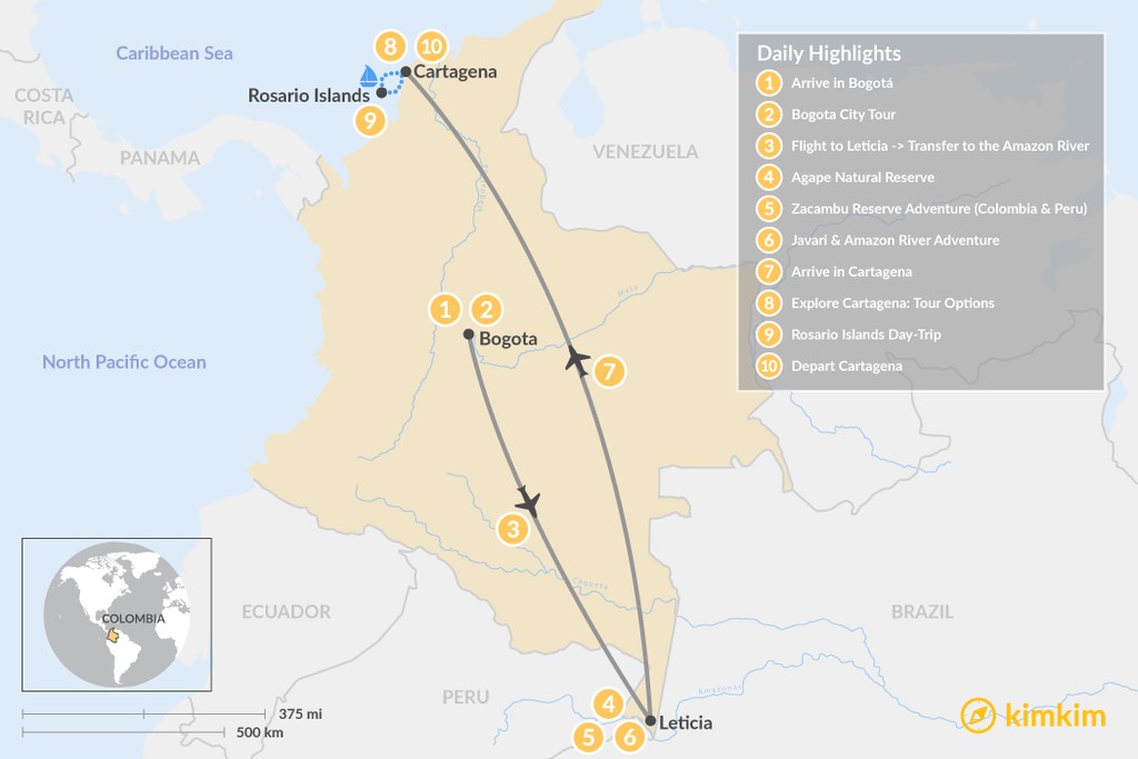 Map of Bogotá, Amazon & Cartagena – 10 Days