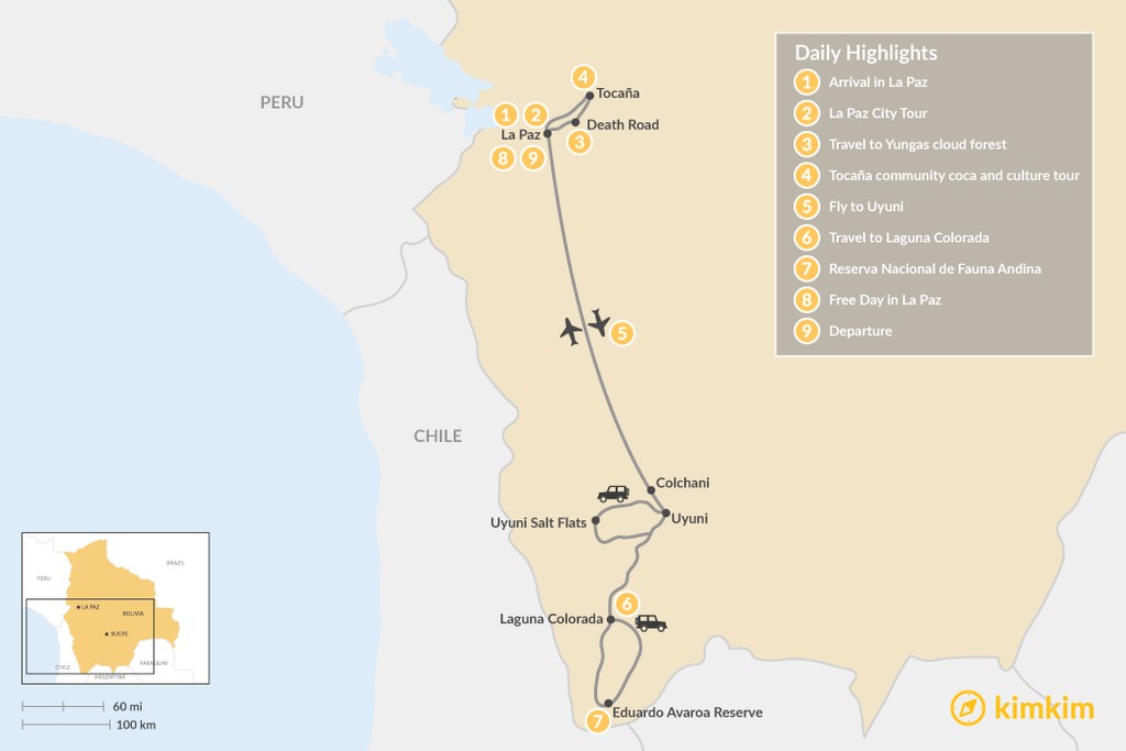 Map of Bolivian Cities, Cloud Forests & Salt Flats – 9 Days
