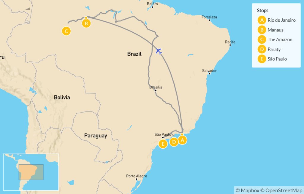 Map of Brazil Discovery Tour: Rio de Janeiro, Amazon Rainforest & Paraty – 11 Days