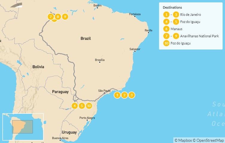 Map of Brazil Highlights: Rio de Janeiro, Iguaçu Falls & Amazon Rainforest – 10 Days