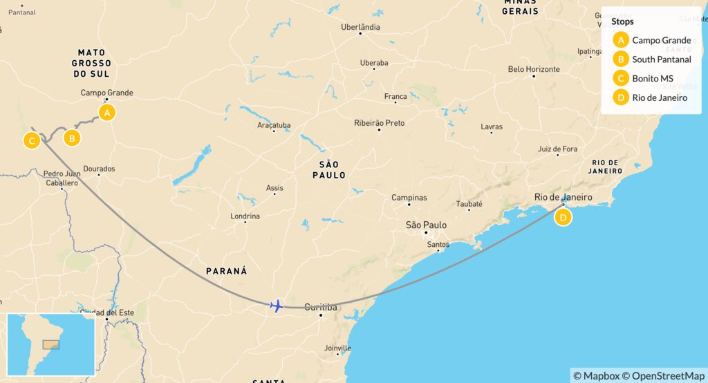 Map of Brazil Outdoor Adventure: Pantanal, Bonito & Rio de Janeiro – 13 Days