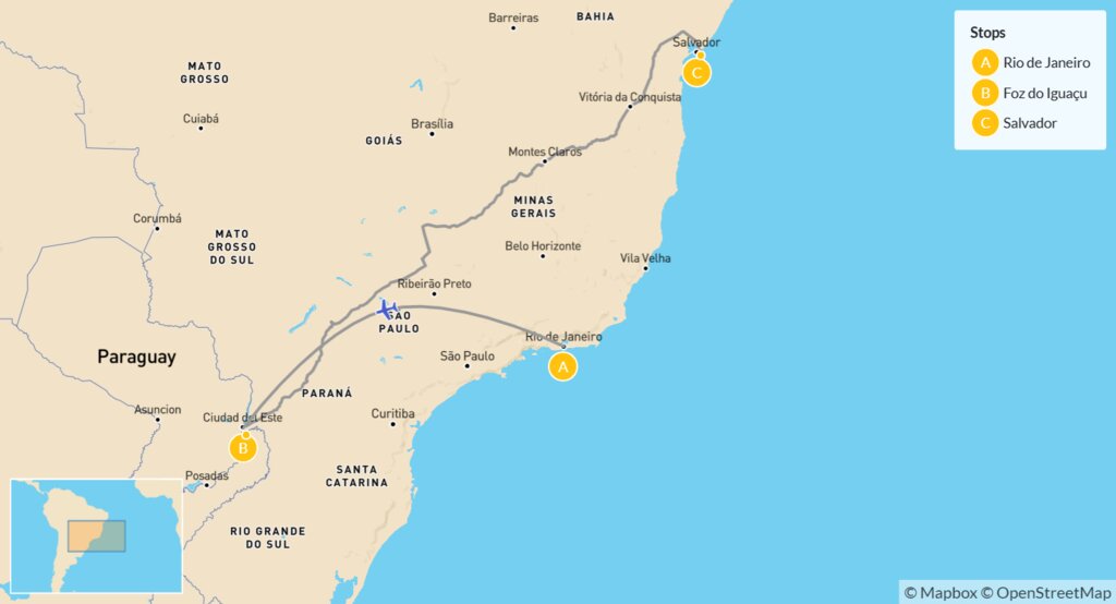 Map of Brazil’s Cities & Natural Wonders: Rio de Janeiro, Iguaçu Falls & Salvador – 8 Days