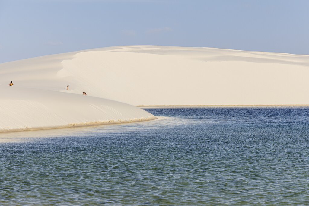 Travel by car ferry across the Rio Preguiças to access the national park, then head off-road through native restinga (coastal sand forests), along loose sandy trails, and over small rivers for approximately one hour. When you arrive at the dunes, continue with your guide on foot—the park is a vehicle-free zone—to visit the lagoons that make up the Lagoa Bonita circuit. Begin with a steep climb up a scrub-covered dune using a rope to pull yourself along until you reach the top. Once there, pause to appreciate the vast expanse of desert landscape interspersed with sparkling freshwater lagoons.