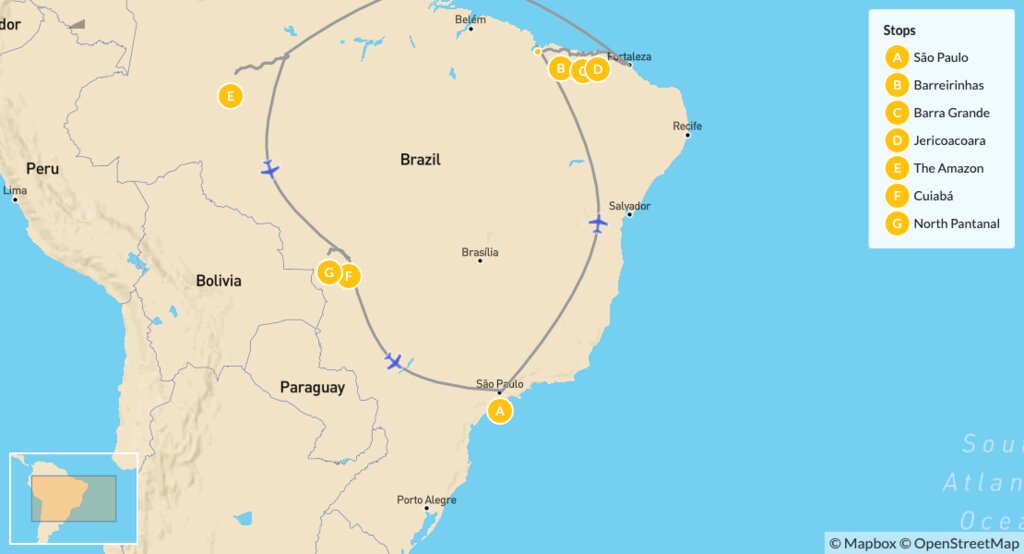 Map of Brazil’s Diverse Natural Landscapes: Lençóis Maranhenses, Parnaíba Delta, the Amazon & North Pantanal – 14 Days