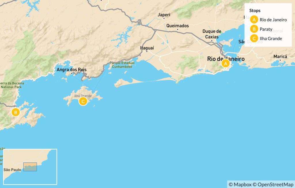 Map of Brazil’s East Coast: Rio de Janeiro, Paraty & Ilha Grande – 14 Days