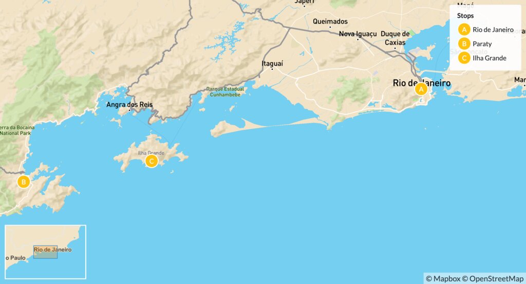Map of Brazil’s Vibrant Coastline: Rio de Janeiro, Paraty & Ilha Grande – 11 Days