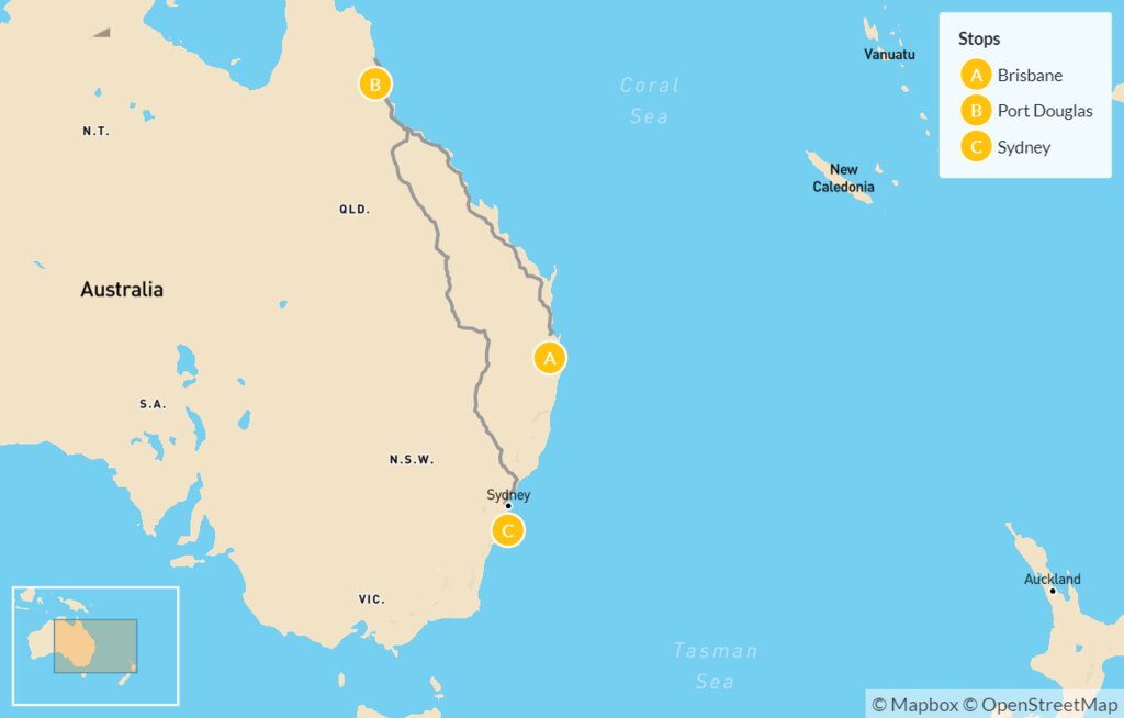 Map of Brisbane, Port Douglas & Sydney Family Adventure – 14 Days