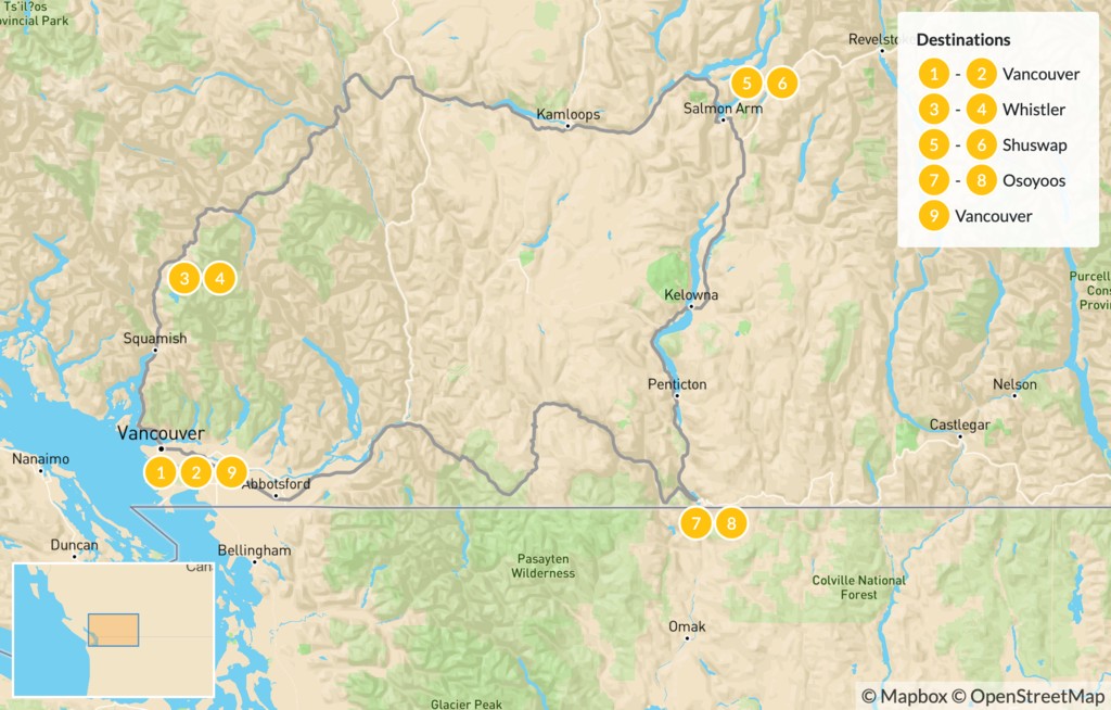 Map of British Columbia Circuit: Whistler, Shuswap, & Okanagan Valley – 10 Days