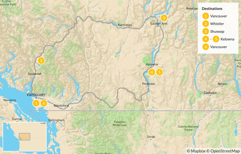 Map of British Columbia Circuit: Whistler, Shuswap & Okanagan Valley – 7 Days