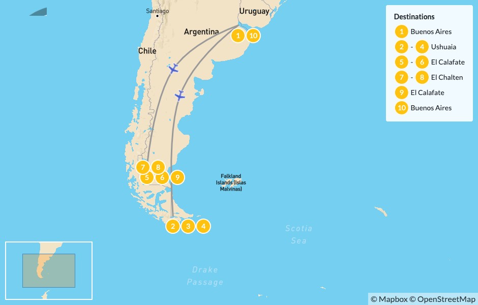 Map of Buenos Aires and Patagonia: Ushuaia, El Calafate & El Chaltén – 11 Days