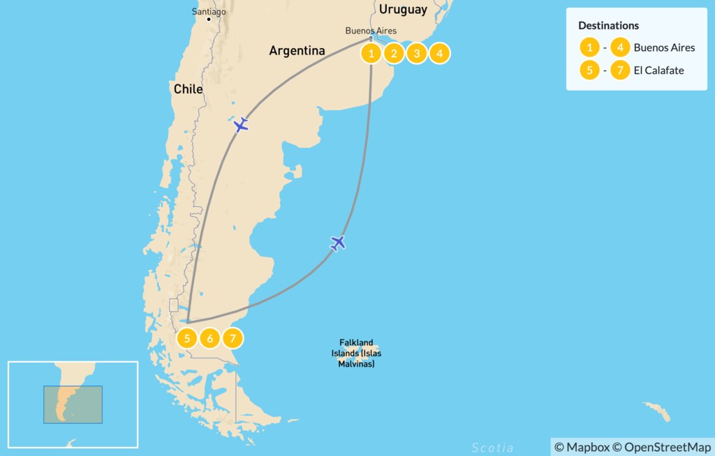 Map of Buenos Aires & Calafate Exploration – 8 Days