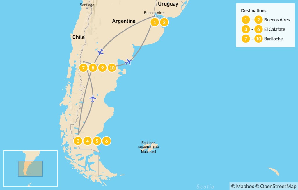 Map of Buenos Aires, El Calafate & Bariloche – 11 Days