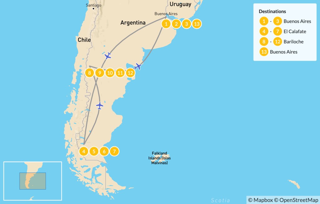 Map of Buenos Aires, El Calafate, & Bariloche – 14 Days