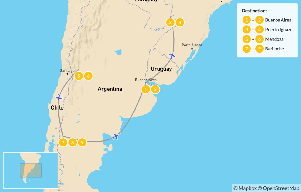Map of Buenos Aires, Iguazú Falls, Mendoza, & Bariloche – 10 Days
