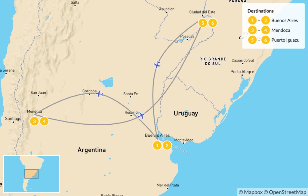 Map of Buenos Aires, Mendoza, & Iguazú – 7 Days