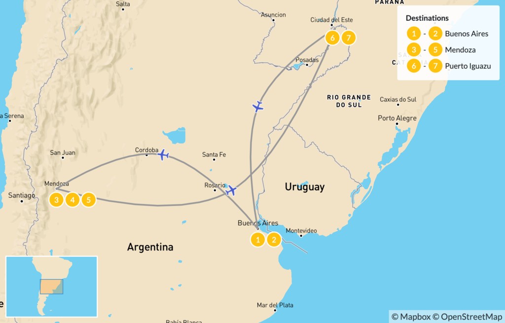 Map of Buenos Aires, Mendoza, & Iguazú – 8 Days