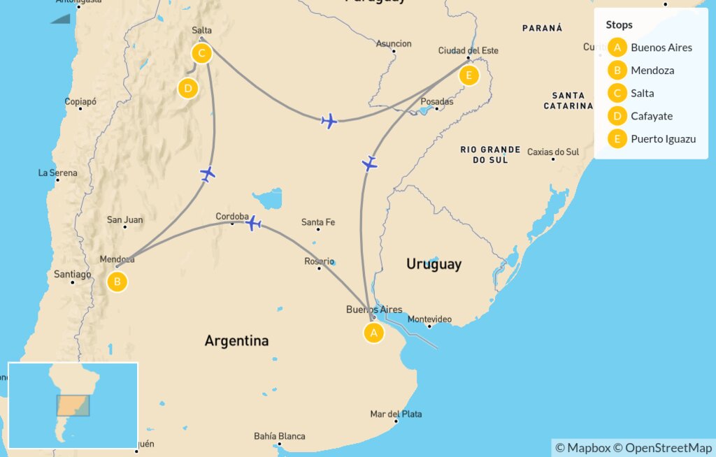 Map of Buenos Aires & Northwest Argentina: Natural Wonders, Waterfalls & Wine – 15 Days