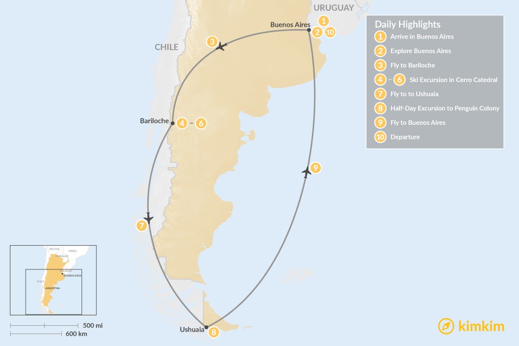 Map of Buenos Aires & Patagonia Ski Adventure – 10 Days