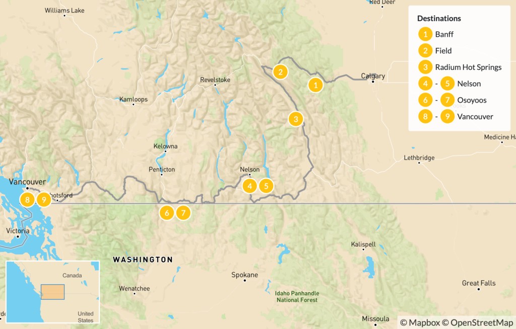 Map of Calgary to Vancouver Road Trip: Banff, Radium, Nelson, & Osoyoos – 10 Days