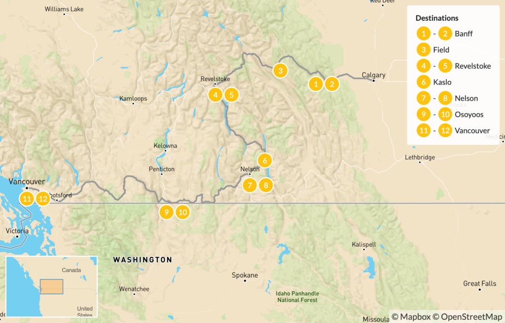 Starting in Calgary and ending in Vancouver, you’ll cross the Canadian Rockies with ample time to explore beautiful Banff National Park. After the Rockies, wind your way south through historic mining towns and lake country to the province’s famous wine region, the Okanagan Valley. Here, in Osoyoos, visit some of the best smaller local wineries that British Columbia has to offer before ending your trip with a day to explore Vancouver.