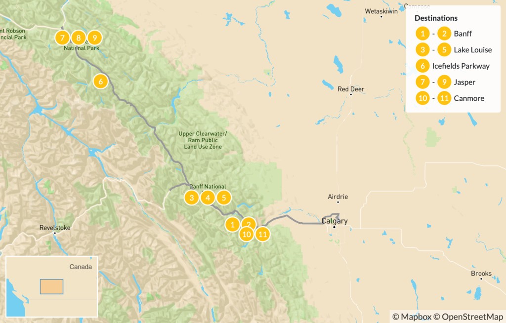 | Day 12 | Canmore to Calgary, Depart (1 h 30 min) |