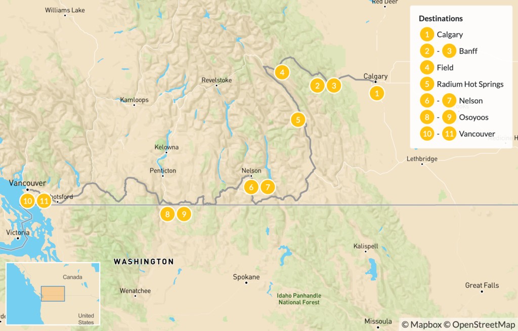 Map of Canadian Rockies to Vancouver: Banff, Radium, Nelson, & Osoyoos – 12 Days