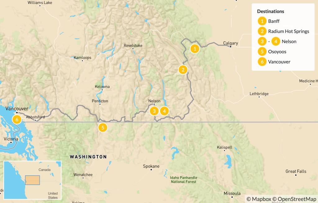 Map of Canadian Rockies to Vancouver: Banff, Radium, Nelson & Osoyoos – 7 Days