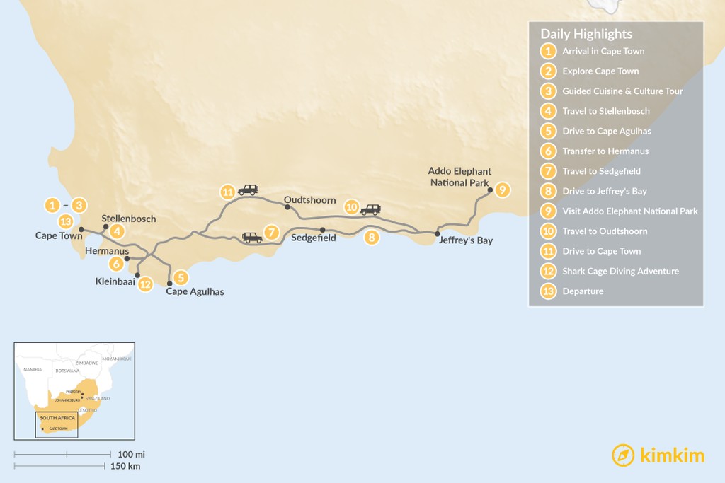 Map of Cape Town & Garden Route Adventure – 13 Days