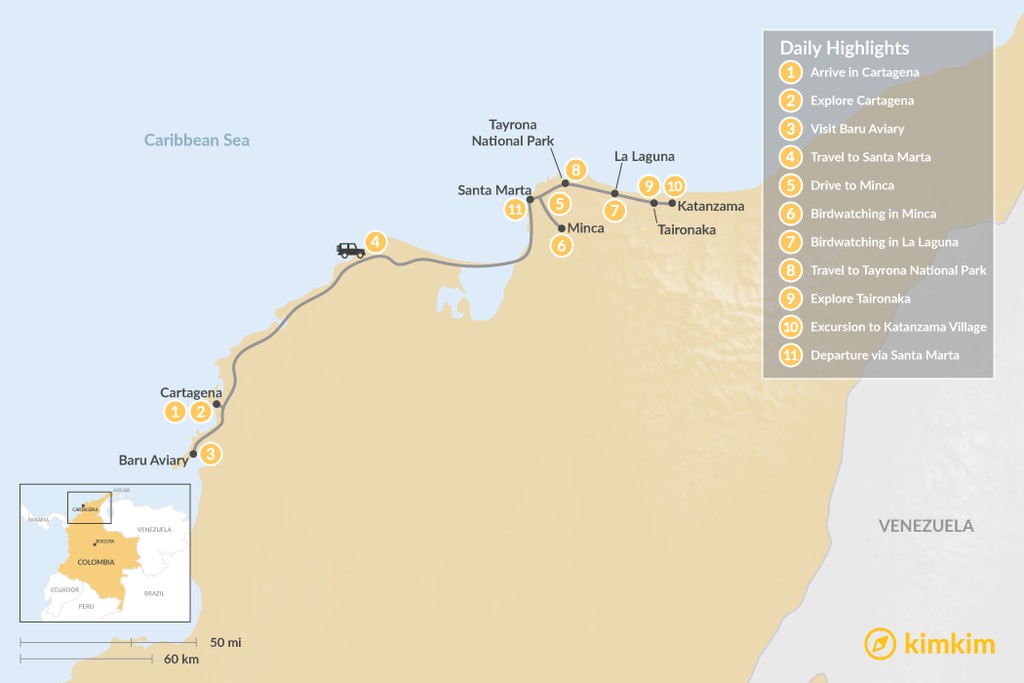Map of Caribbean Birding Tour in Colombia: Cartagena, Minca, & Tayrona National Park – 11 Days