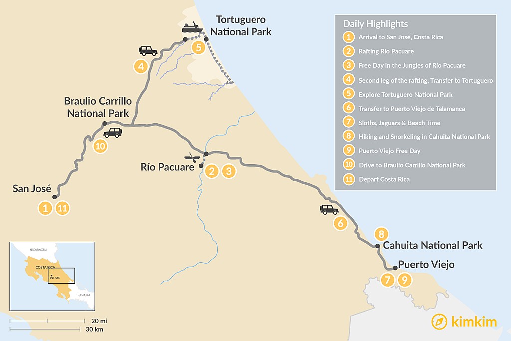 Map of Caribbean Coast Adventure Tour – 11 Days