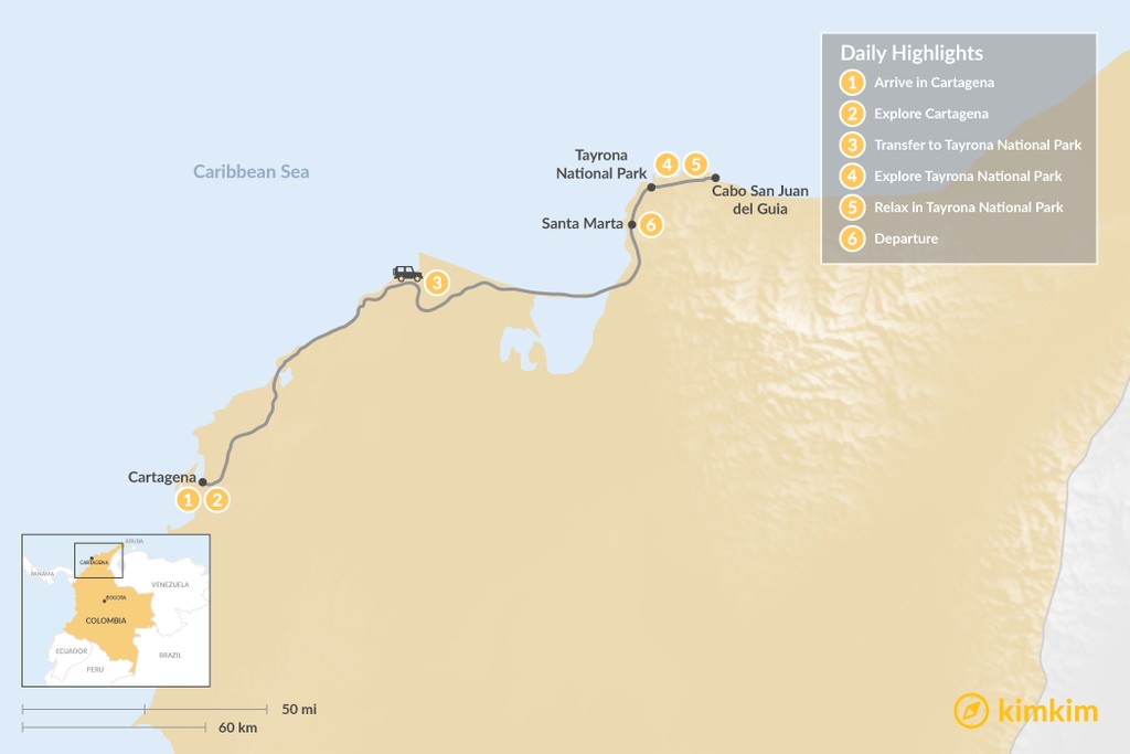 | Day 3 | Cartagena -> Transfer to Parque Nacional Natural Tayrona | Santa Marta |