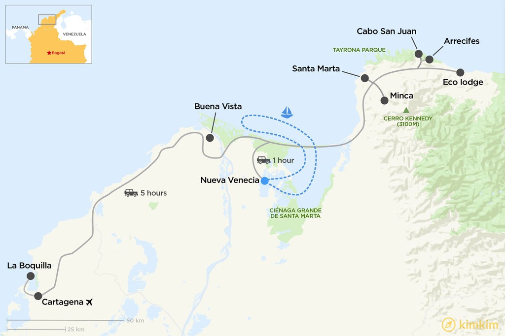 Map of Cartagena, Tayrona Park, Arrecife and Cabo San Juan – 9 days