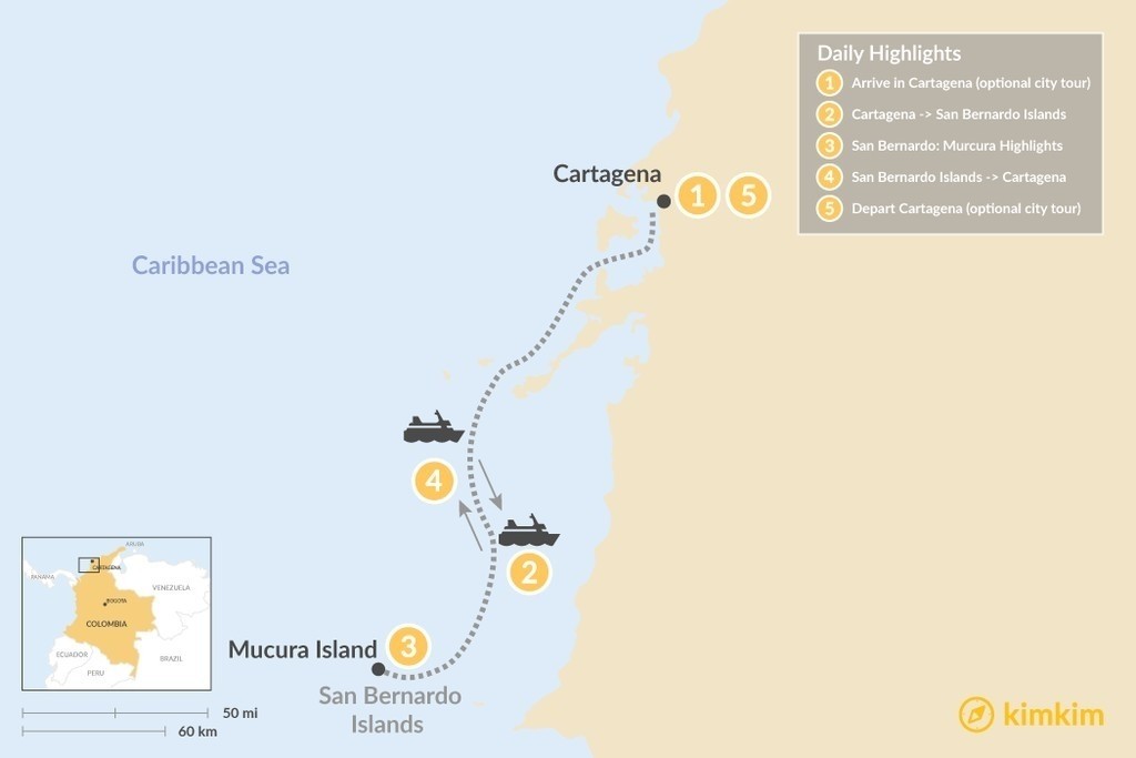 Map of Cartagena & the San Bernardo Islands – 5 Days