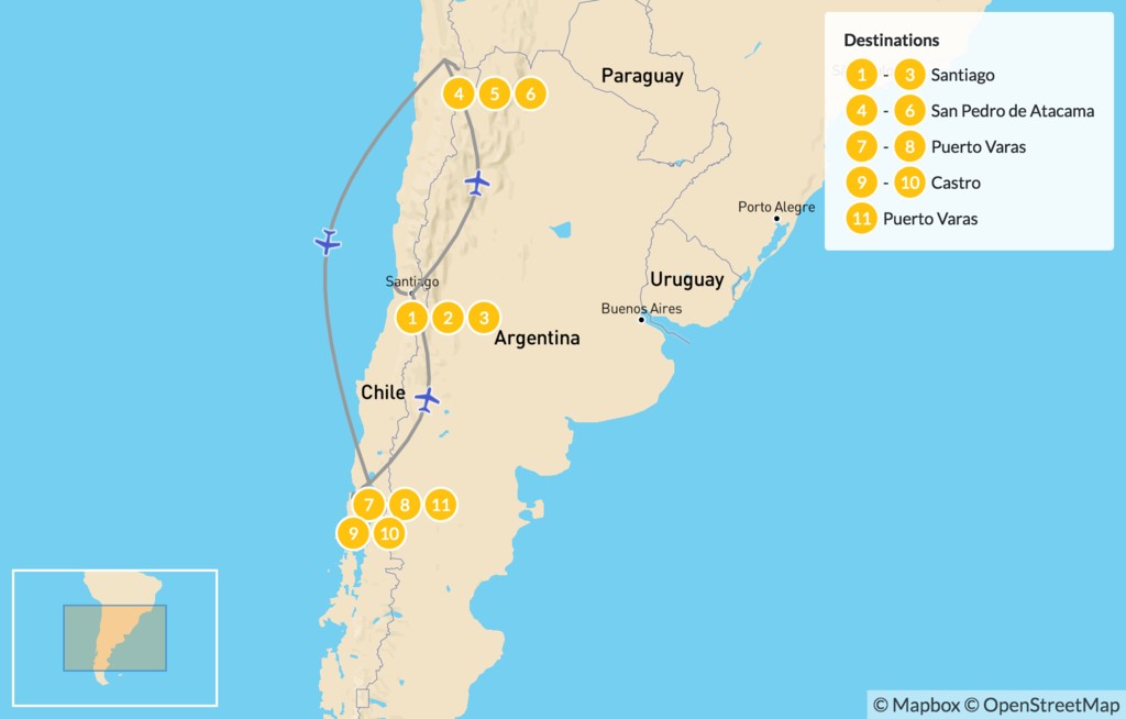 Map of Central Chile, Lake District & Atacama Desert – 12 Days