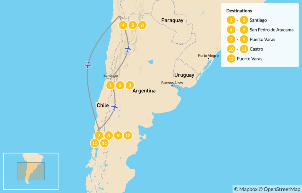 Map of Central Chile, Lake District & Atacama Desert – 13 Days