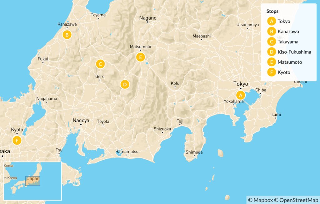 Map of Central Japan Highlights: Tokyo, Kyoto & the Kiso Valley – 9 Days