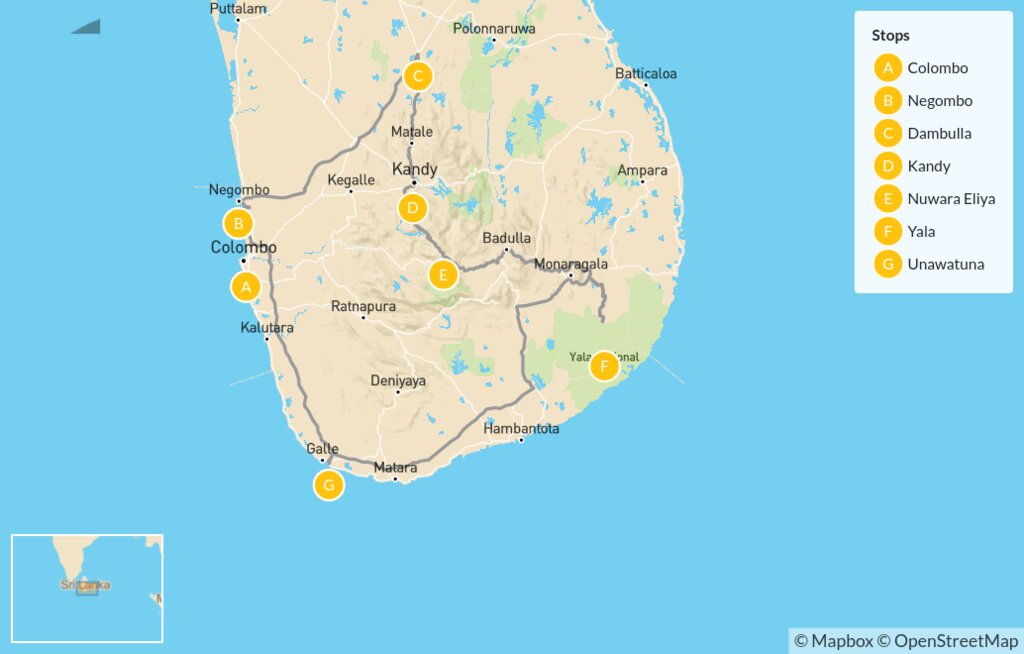 Map of Central & Southern Sri Lanka: Wildlife, Culture & Beaches – 12 Days