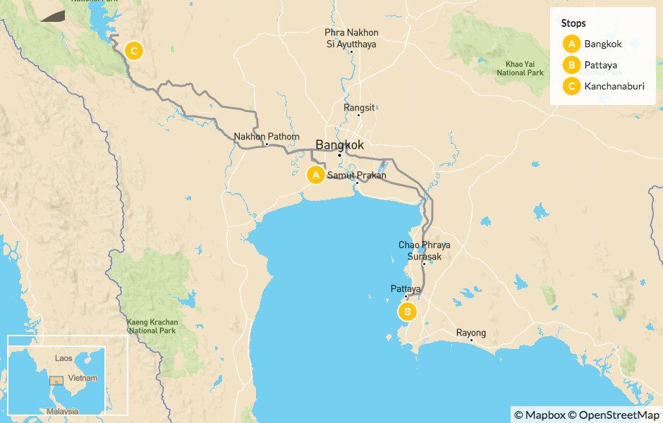 Map of Central Thailand: Pattaya, Bangkok & Kanchanaburi – 10 Days
