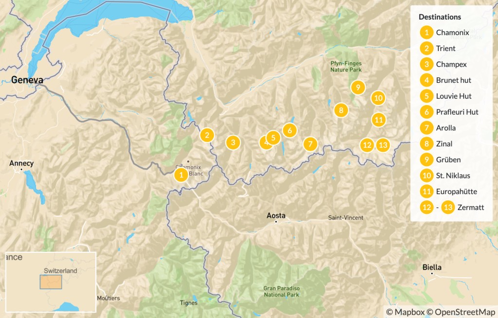 Map of Chamonix to Zermatt Walker’s Haute-Route – 14 Days