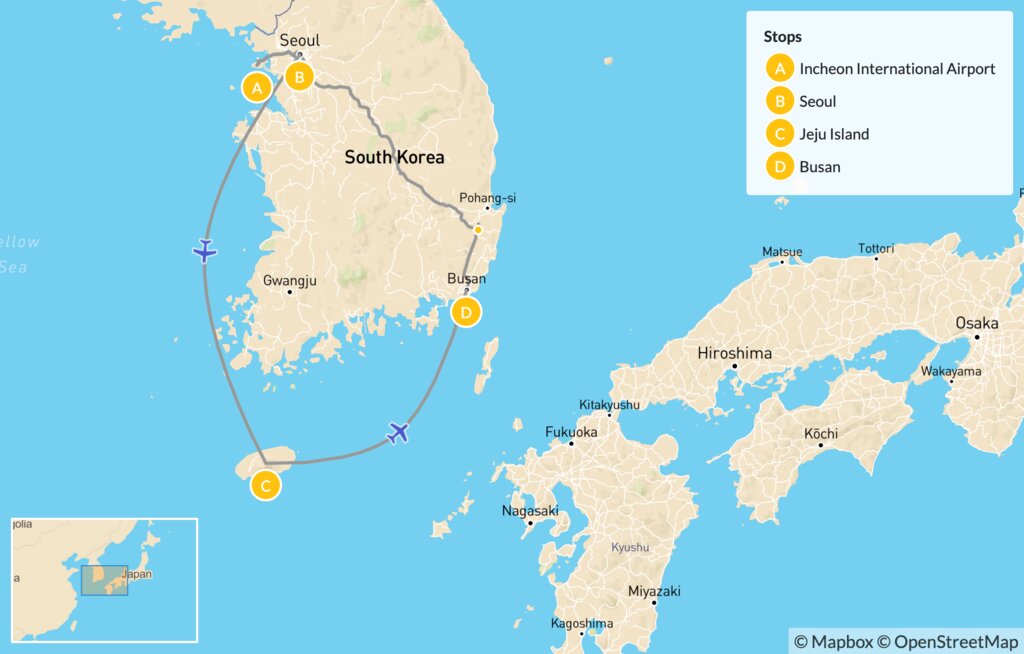 Map of Chasing Cherry Blossoms in South Korea: Seoul, Jeju Island & Busan – 8 Days