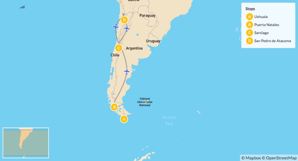 Map of Chile & Argentina Fjord Cruise & Desert Adventure – 14 Days