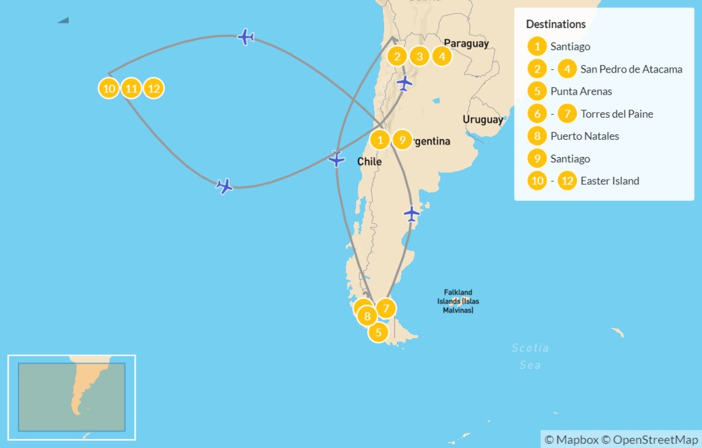Map of Chile Grand Tour: Santiago, Atacama Desert, Torres del Paine, & Easter Island – 13 Days
