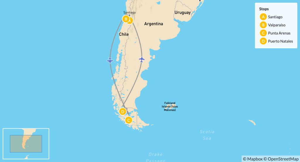 Map of Chile Outdoor Adventure for Families: Santiago, Valparaíso & Patagonia – 10 Days