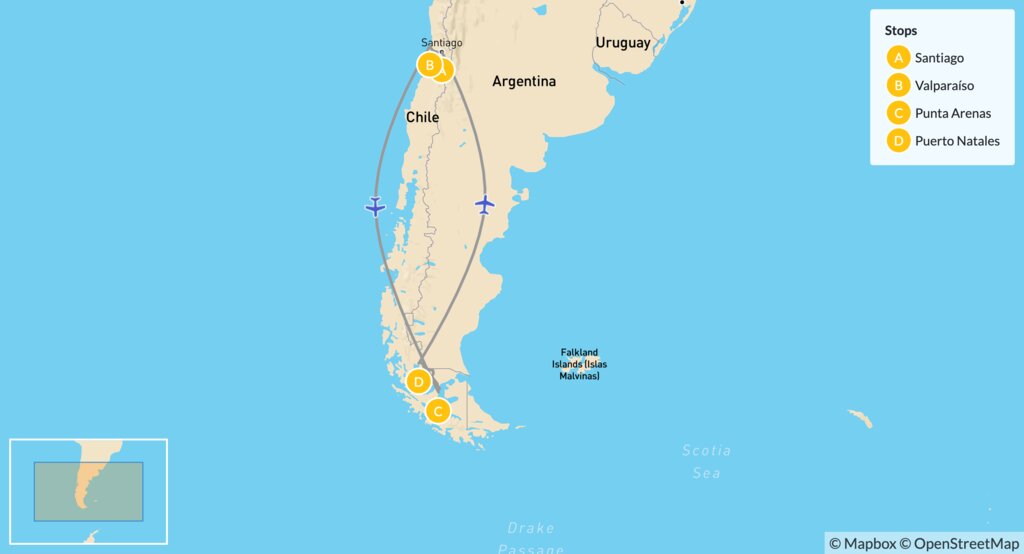 Map of Chile Outdoor Adventure for Families: Santiago, Valparaíso & Patagonia – 14 Days