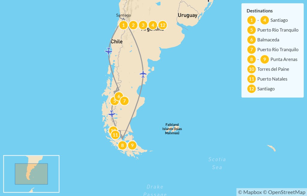 Map of Chile: Santiago, Pacific Coast, Patagonia, & More – 13 Days