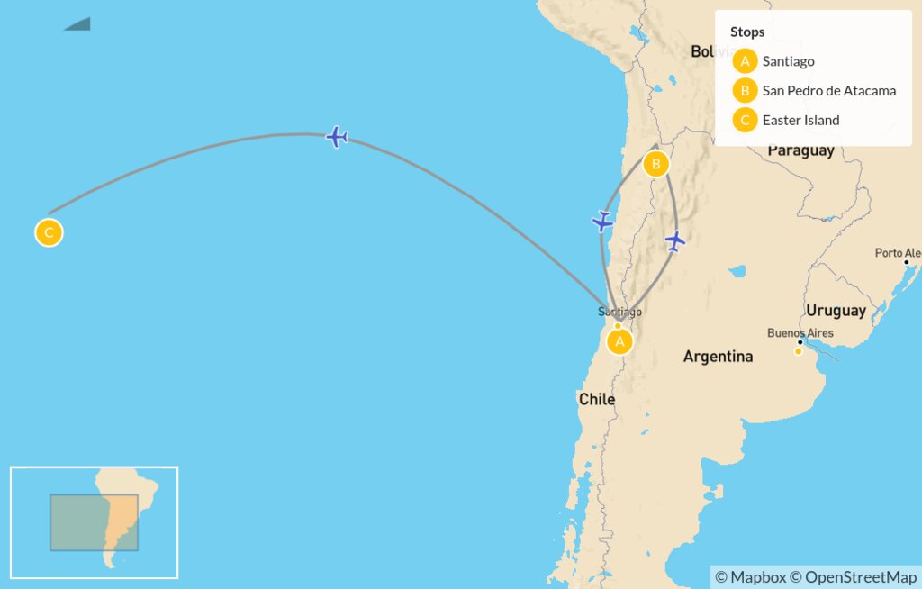 Map of Chilean Culture & Nature: Santiago, Atacama Desert & Easter Island – 11 Days